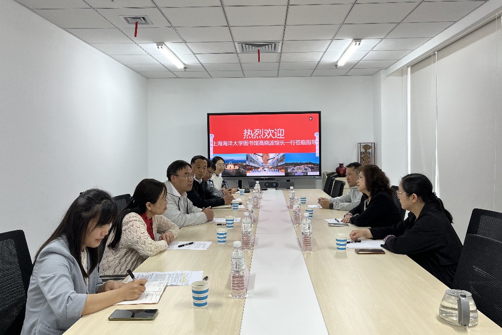 参观结束后,双方召开调研座谈会,并进行了深入的沟通与交流。谷强馆长介绍了我校的基本概况及图书馆的历史沿革、部室设置、特色馆藏,分享了图书馆在空间建设、智慧化发展、学科服务、资源建设等多个领域开展的探索与实践。他表示,同为涉海高校,两校友谊源远流长,海大图书馆愿进一步深化推进两馆交流与合作,为两校学科建设与人才培养提供更具价值的文献保障与资源支持。高晓波馆长介绍了上海海洋大学的基本情况与图书馆的发展现状,阐述了本次调研的背景与主要方向,希望通过此次调研进一步增进双方的业务交流与深入合作。随后,双方围绕图书馆深层次服务拓展、涉海高校图书馆联盟建设、图书馆智慧服务创新、机构知识库运行管理及读者服务创新实践等方面展开全面、深入的交流,为两馆未来的发展提供了诸多有益的思路与借鉴。