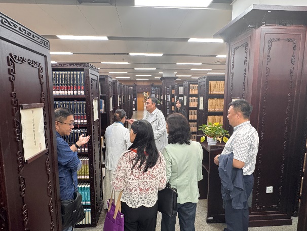 在南京大学调研期间,南京大学图书馆馆长黄贤金等馆党政领导及相关部门负责人热情接待了调研团队。座谈会上,黄馆长从历史传承、科技赋能、学科支撑等多个维度,系统介绍了南京大学图书馆的建设发展情况,并就资源建设、阅读推广、古籍资源开发及智慧图书馆服务等主题与我校调研团队进行深入探讨。会后,调研团队实地参观了南京大学杜厦图书馆,重点考察了古籍阅览室、图书馆大厅等特色空间的文化推广与功能建设情况。