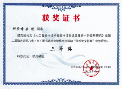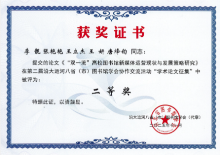 为深化区域协作与经验互鉴,八省市图书馆学会于今年5月联合发起学术征文、案例征集等活动。其中,学术征文活动共收到来自全国各地的学术论文208篇。我馆馆员李靓的《“双一流”高校图书馆新媒体运营现状与发展策略研究》、庞萍的《数智时代高校图书馆员胜任力结构及其跃迁——基于用户关系的实证分析》2篇论文荣获二等奖,解登峰的《人工智能体技术在图书馆自适应服务中的应用研究》荣获三等奖。这些获奖成果不仅展现了我馆在新媒体运营创新、数智化服务能力提升及自适应服务技术突破等领域的积极探索与实践成效,也彰显了我馆馆员的学术实力与风采。