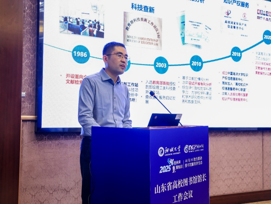 大会还对2025年山东省高校图工委主办的部分活动的获奖单位和个人进行了表彰。我馆获评“山东省高校图书馆学科服务工作研讨会暨优秀案例征集评选”优秀组织奖,宋业垚老师荣获“2025年度山东省高校图书馆优秀馆员”荣誉称号,吴进老师申报的案例《夯实·融合·嵌入:中国海洋大学图书馆信息素养教学服务实践》荣获第四届“知网杯”高校图书馆服务创新案例一等奖,李靓老师申报的案例《高校图书馆馆办刊物建设新思路——以中国海洋大学图书馆馆刊〈阅海〉为例》荣获案例优秀奖。