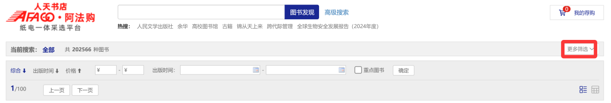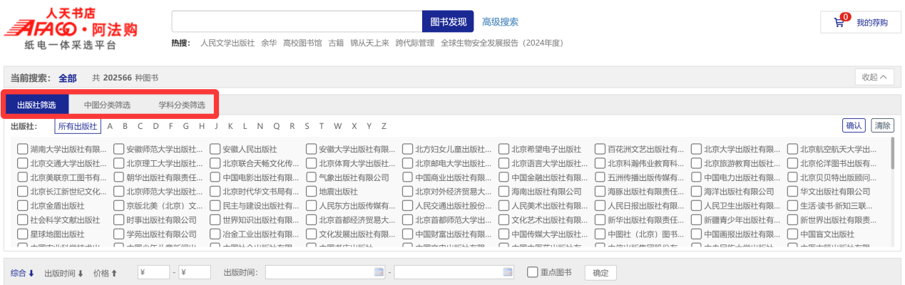 1.2 点【更多筛选】可按出版社、中图分类法、学科分类筛选出所需图书。