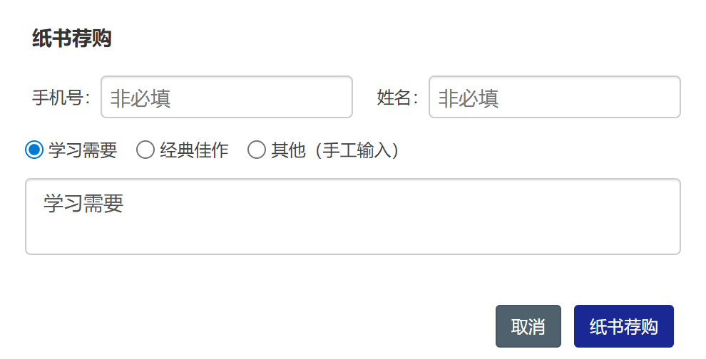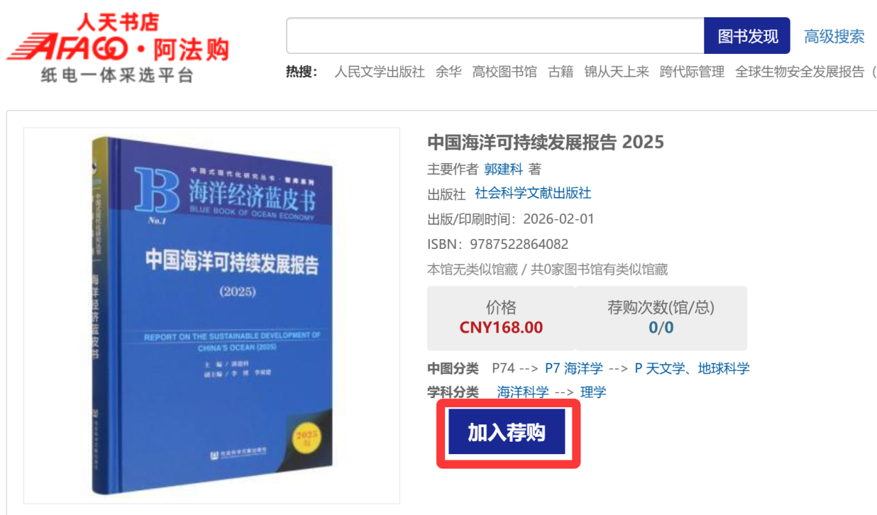 点击图书进入详情页面→【加入荐购】→填写【手机号】【姓名】【荐购理由】(参与评奖必填)→点击【纸书推荐】